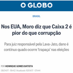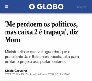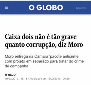 Em 2019, após reiterar que era trapaça, Moro disse que Caixa 2 não era tão grave quanto o enriquecimento ilícito.