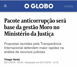 A fala de Moro foi aplaudida em Harvard e a cruzada contra a corrupção transformou o juiz em uma espécie de herói nacional e o Super Moro estampava camisetas em manifestações populares coloridas de verde e amarelo. Como consequência, mesmo tendo afirmado em mais de uma ocasião que jamais entraria para a política, aceitou largar a toga para se tornar ministro no governo de Jair Bolsonaro. A contradição não incomodou aos fãs do paladino da Justiça. E assim que aceitou o convite, Moro deixou claro que o “Pacote anticorrupção” seria a base de sua gestão.