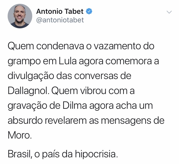 Ofereço um tuíte do próprio procurador Deltan Dallagnol, de 20 de março de 2016. “Para Dotti [jurista René Dotti que, na ocasião, estava defendendo Sérgio Moro] no conflito entre direito à informação sobre crime grave e direito à privacidade, ganha interesse público.”