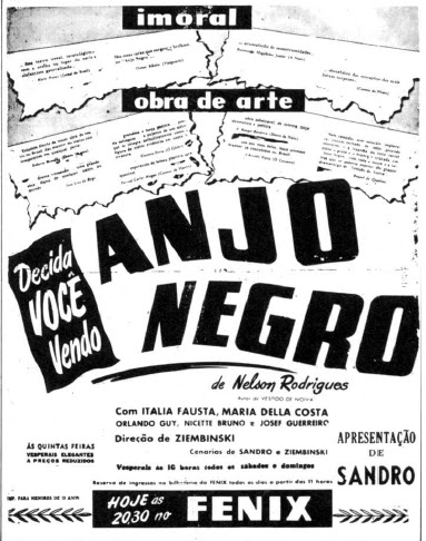 A reação de Nelson? Aproveitar a publicidade gerada pela censura para conseguir mais público depois da liberação. É o que podemos ver nesse cartaz da peça Anjo Negro.