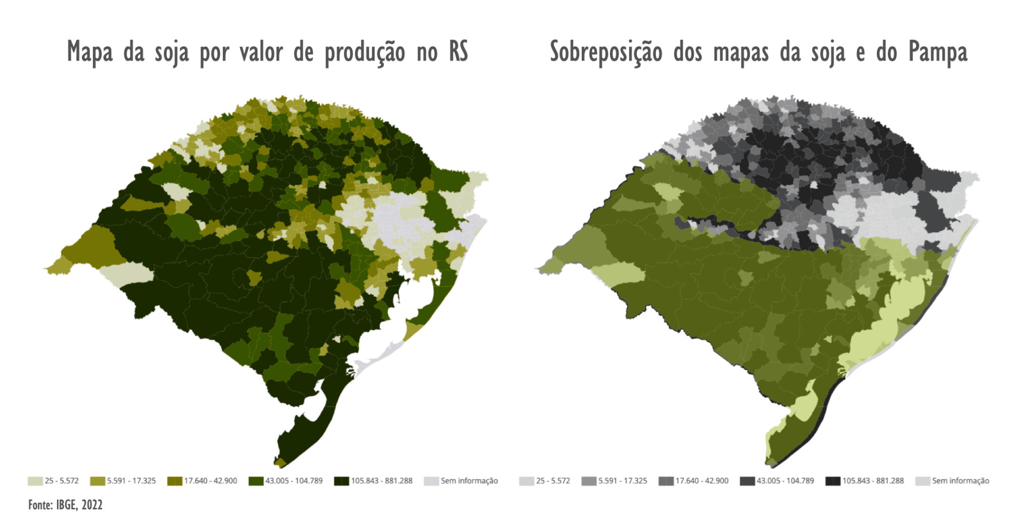 O grão representa o maior valor de produção do país. O Rio Grande do Sul é o terceiro maior produtor de soja do país. Segundo dados do Instituto Brasileiro de Geografia e Estatística (IBGE), o valor da produção em 2022 foi de 345 milhões de reais. O maior produtor é Dom Pedrito, na região da Fronteira com o Uruguai. No Pampa. O mapa do cultivo da soja e o do bioma invisível se sobrepoem.