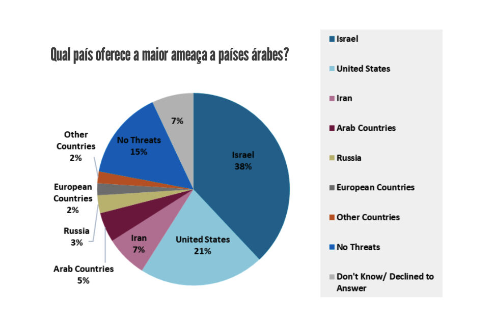 Mesmo antes desse conflito, o Índice de Opinião Árabe de 2022, pesquisa realizada no segundo semestre do ano passado com mais de 33 mil pessoas em 14 países árabes pelo Centro Árabe de Pesquisa e Estudos Políticos em Doha, Catar, apontou que 76% das pessoas ouvidas entendem que a questão política-territorial na região é um problema de todos os árabes e não só dos palestinos. Dos que responderam ao questionamento, 84% disseram que se oporiam ao reconhecimento diplomático de Israel por parte de seus países. Mais do que isso, 38% consideram Israel uma ameaça à segurança do mundo árabe e 20% apontaram os Estados Unidos como um perigo. O motivo é a vinculação do desrespeito a acordos territoriais firmados e que não são cumpridos.