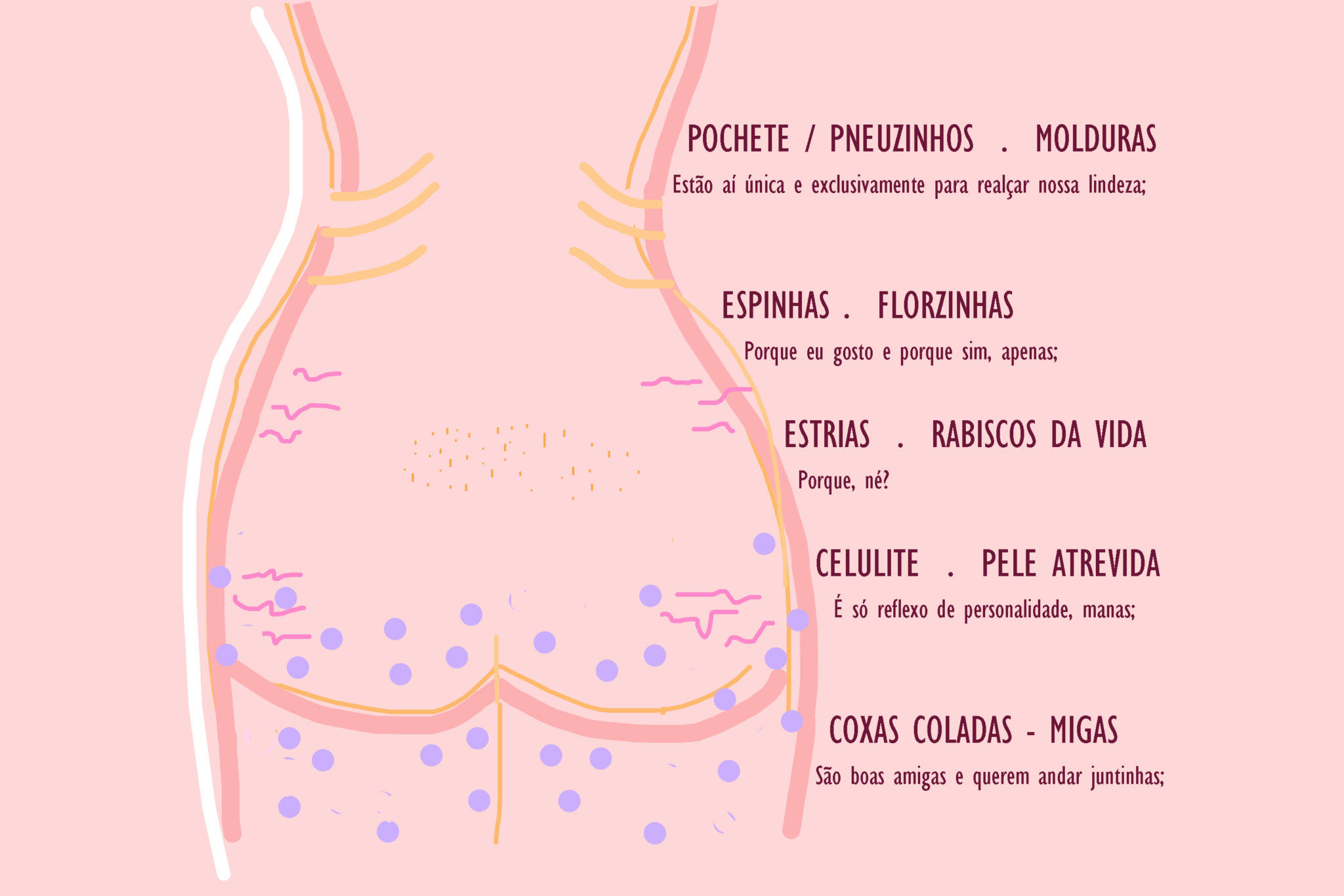 Tirar a carga do nome pejorativo é um passo enorme no caminho da aceitação. Há pouco tempo, falei aqui sobre minhas inseguranças e a decisão de aceitar meu corpo e amar meu corpo. E parar de chamar os traços do meu corpo de “falhas” é um passo enorme. Então, vou renomear todas as minhas “coisinhas.”