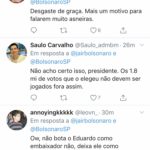 Jair, na mesma ocasião em que anunciou a possibilidade de indicá-lo, garantiu que Eduardo é a melhor pessoa para ocupar o posto de embaixador nos Estados. “Ele é amigo dos filhos do Trump, fala inglês e espanhol, e tem uma vivência muito grande no mundo. Poderia ser uma pessoa adequada e daria conta do recado perfeitamente”, disse o presidente.