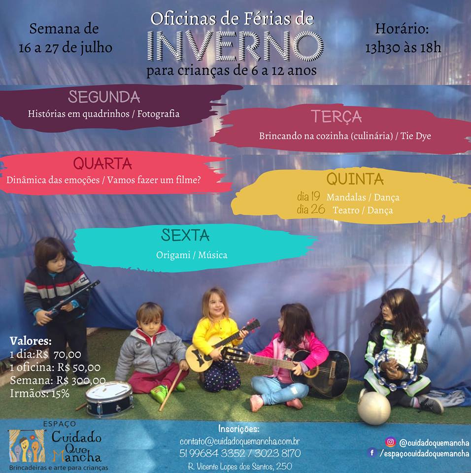 Virei mesmo fã. De seguir no Facebook – eu detesto Facebook. Para quem acredita nisso, para quem não acredita, para quem não sabe o que achar: as férias estão aí, e o Espaço Cuidado Que Mancha segue com a programação de sempre e ainda preparou uma programação especial para o mês de julho. Levando em conta tudo o que está dito aí em cima, que as crianças precisam brincar e aprender por prazer. Sem pressão, sem castigos.