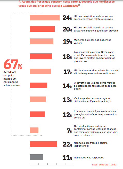 Esse cenário investigado pela União Pró-Vacina sofreu uma transformação, sobretudo diante da extinção de grupos e vídeos considerados inadequados ou propagadores de mentiras por plataformas de redes sociais. Isso mais recentemente. Só que o estrago feito, ainda tem eco. Um estudo de 2019 da Sociedade Brasileira de Imunizações e da Avaaz mostrou que dois em cada três brasileiros acreditam em pelo menos uma afirmação imprecisa sobre vacinação.