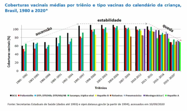 “Todo dia nascem novas pessoas, todo dia a gente tem novas gerações de pais de mães que chegam e que começam a se questionar. E a gente baixou a guarda no momento em que não poderia baixar, porque a gente via crescer o número de movimentos anti-vacina”, explicou. Baixou-se a guarda a partir de uma ideia de que a população brasileira já tinha uma cultura vacinal apropriada, propícia para receber esse processo de vacinação, que aceitava a vacinação como sendo mandatória, mas era uma ilusão. Segundo o Dr. Akira Homma, a cobertura vacinal vem caindo no Brasil há anos. “A queda da vacinação já estava acontecendo há uns cinco anos. A pandemia só acentuou essa queda.” Ou seja, a Covid não é o nascedouro dessa queda dos dados, é só mais um contexto modificador.